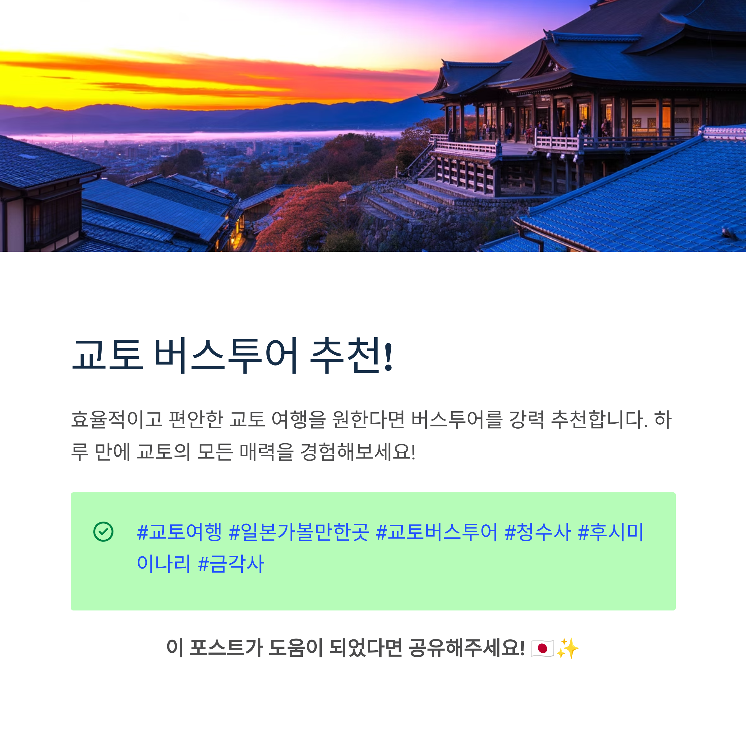 교토는 전통과 자연이 살아 숨 쉬는 도시로, 자유여행으로는 교통이 다소 불편하다는 단점이 있습니다. 이번에 저는 교토 버스투어를 이용해 하루 만에 주요 명소를 편리하게 둘러보고 왔습니다. 청수사, 후시미이나리, 아라시야마, 금각사까지 교토의 핵심 코스를 모두 담은 일정이었어요.
