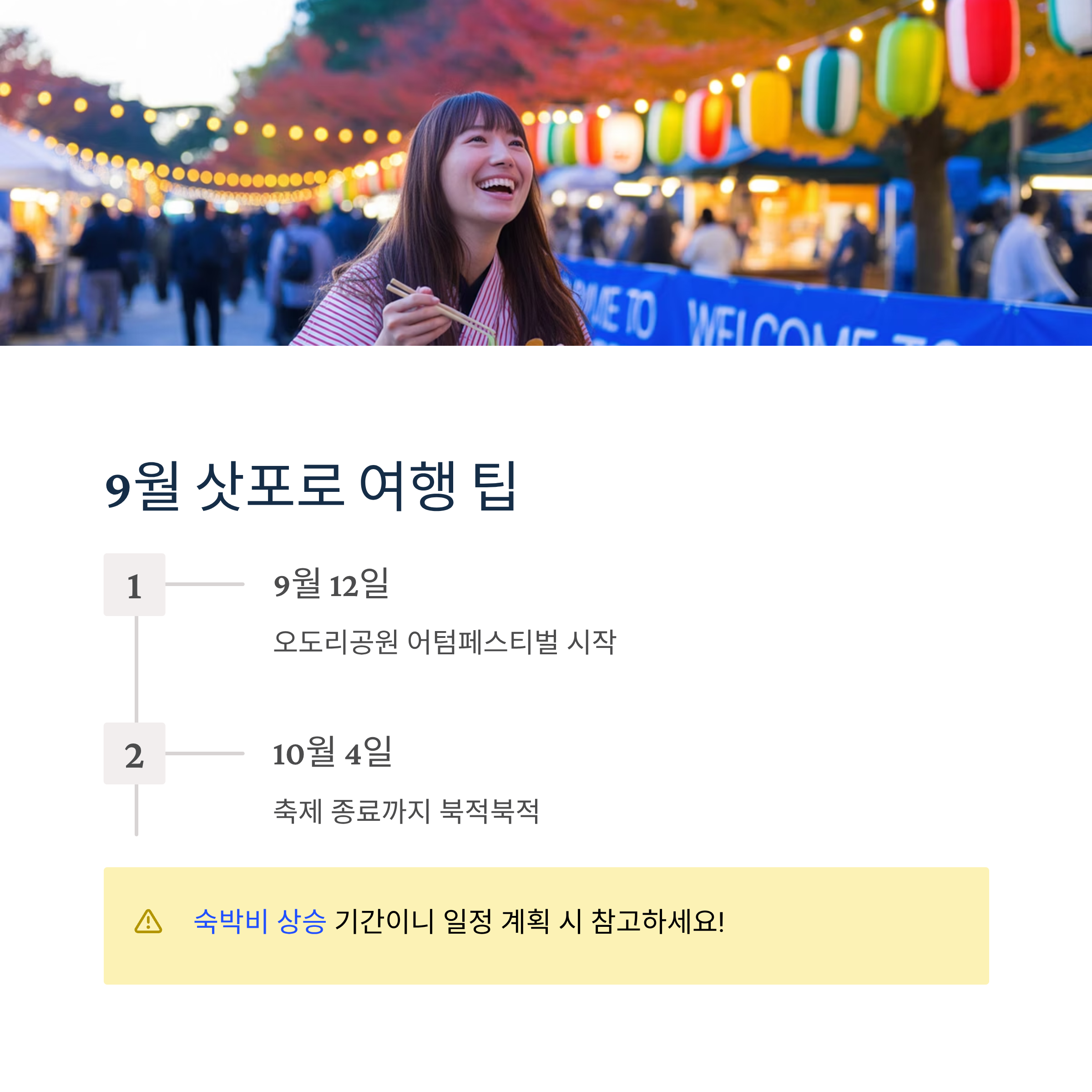9월 12일부터 10월 4일까지는 오도리공원에서 어텀페스티벌이 열려 현지인과 관광객들로 북적입니다. 덕분에 숙박비가 크게 오르니 일정을 잡으실 때 반드시 참고하세요.